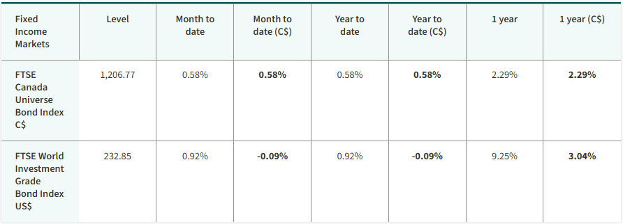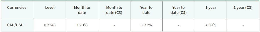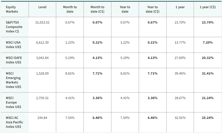 The S&P/TSX Composite Index edged higher, reaching a new record high. The energy sector was the best-performing sector. U.S. equities advanced over the month. Government of Canada 10-year bond yields finished largely unchanged, while the yield on U.S. Treasury bonds increased. Oil and gold prices rose in January. Gold, along with steel and copper, reached new record highs.
